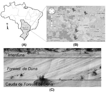 ![]() Figura 2. (A) Mapa da Bacia do Paraná; (B) localizaçao geográfica das localidades (afloramentos) onde as amostras foram coletadas; (C) arenito eólico da Formaçao Pirambóia com as fácies sedimentares avaliadas