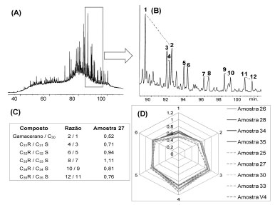![]() Figura 3. Etapas do procedimento adotado na aplicaçao do método de Kaufman para as amostras selecionadas. A) obtençao dos cromatogramas por CG-DIC; B) escolha dos terpanos pentacíclicos (picos adjacentes); C) cálculo das razoes diagnósticas; D) diagrama estrela plotado com as razoes calculadas