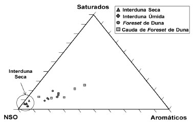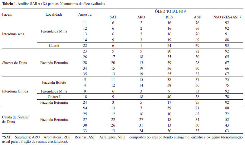 De acordo com os resultados já apresentados, as fácies de foreset e cauda de foreset de duna apresentam perfis estrela semelhantes e, em geral, composiçao com maior concentraçao de saturados e aromáticos que as amostras da fácies de interduna. Na amostra coletada da Fazenda Betumita, a fácies de Interduna úmida apresentou um perfil estrela distinto do observado para as outras duas fácies, sugerindo a existência de variabilidade composicional. Este resultado corrobora com as observaçoes feitas por Araújo et al.,28 que identificaram a fácies de interduna rica em argilominerais como uma barreira de fluxo ao óleo. De forma semelhante, Rangel et al.29 estudando os perfis cromatográficos de amostras do campo de Cicuco-Boquete na Colômbia identificaram subgrupos de heterogeneidades composicionais em um reservatório associadas às barreiras sedimentares.