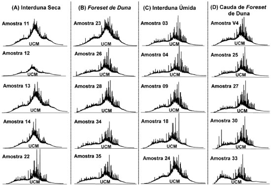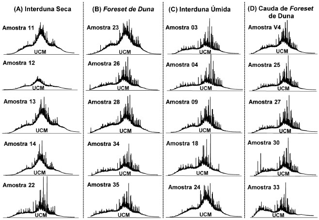 Figura 5. Cromatogramas obtidos da análise por CG-DIC da fraçao de hidrocarbonetos saturados: (A) fácies de interduna seca; (B) fácies de foreset de duna; (C) fáceis de interduna úmida e (D) fáceis de cauda de foreset de duna