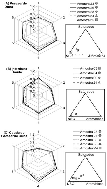 Os perfis cromatográficos da Figura 5 revelaram a ausência de n-alcanos de baixo a médio peso molecular, com predominância de compostos de maior massa molecular que favorece a elevaçao da linha de base (UCM - unresolved complex mixture). A remoçao de n-alcanos com o aumento da biodegradaçao resulta, como o nome sugere, em uma mistura muito complexa de compostos, em grande parte desconhecidos, que nao podem ser facilmente resolvidos por cromatografia gasosa convencional.3-4,26 Brient et al.27 sugerem, a partir da análise do óleo total, que alguns destes compostos desconhecidos sao ácidos naftênicos, tais como os ácidos ciclopentil e ciclohexil substituídos. Neste trabalho, observou-se que todas as amostras avaliadas apresentaram elevada UCM, com maior evidência para as amostras da fácies interduna seca, mesmo a análise tendo sido feita a partir da fraçao de hidrocarbonatos saturados. Isto mostra que compostos cíclicos/ramificados presentes nesta fraçao também contribuem para a elevaçao da UCM e nao somente os compostos polares. Os resultados obtidos com a análise SARA e com os perfis cromatográficos da fraçao de hidrocarbonetos saturados permitiu diferenciar as amostras quanto ao nível de biodegradaçao, mostrando que aquelas pertencentes à fácies de interduna seca possuem o maior nível de biodegradaçao comparada com as demais amostras analisadas. A partir desses resultados fica evidente que o método de Kaufman, o qual identifica heterogeneidades composicionais em óleos crus com hidrocarbonetos preservados, nao pode ser aplicado para estas amostras sem que haja uma modificaçao prévia. Assim, o método de Kaufman foi aplicado neste trabalho utilizando os compostos terpanos pentacíclicos (mais resistentes à biodegradaçao) para o cálculo das razoes diagnósticas usadas na investigaçao da variabilidade composicional. As amostras pertencentes à fácies de interduna seca foram classificadas como sendo as mais severamente biodegradadas quando comparadas com as das outras fácies e, por isso, nao foi possível a aplicaçao do método para avaliar a presença de heterogeneidades composicionais nem utilizando os terpanos pentacíclicos para estas amostras, visto que até estes compostos mais resistentes foram consumidos durante o processo de biodegradaçao. Para análise da variabilidade composicional das demais amostras, inicialmente, comparou-se as pertencentes à mesma fácies sedimentar (foreset de duna, interduna úmida e cauda de foreset de duna), e depois fez-se uma comparaçao daquelas de mesma localidade (ver Tabela 1) e diferentes fácies sedimentar. Os resultados obtidos foram plotados em diagramas estrela e ao lado de cada diagrama plotou-se o gráfico ternário da análise SARA para as amostras correspondentes a cada fácies analisada. A Figura 6 mostra os diagramas estrela plotado a partir das razoes de hopano C30/gamacerano e homopanos de C31-C35 R/S para todas as amostras avaliadas.