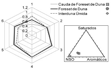 ![]() Figura 7. Diagrama estrela para avaliaçao de heterogeneidades composicionais entre as fácies: foreset de duna; inteduna úmida e cauda de foreset de duna utilizando as seguintes razoes diagnósticas: 1- hopano C30/gamacerano, 2- C31R/C31S, 3- C32R/C32S, 4- C33R/C33S, 5- C34R/C34S, 6- C35R/C35S