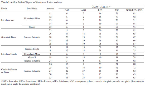 PARTE EXPERIMENTAL Amostras Os óleos avaliados neste estudo foram extraídos de rochas reservatório provenientes da Formaçao Pirambóia, coletadas na borda lesta da Bacia do Paraná no Estado de Sao Paulo. Foi selecionado um grupo de 20 amostras de rocha reservatório retiradas de afloramentos (Guareí e Fazendas da Mina, Betumita e Bofete), sendo cinco amostras de cada uma das seguintes fácies sedimentares: foreset de duna, cauda de foreset de duna, interduna úmida e interduna seca, conforme mostra a Figura 2.