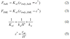 nas quais ctruly representa a concentração do composto químico verdadeiramente dissolvido em água (ng m-3); c* é a concentração do composto químico dissolvido em equilíbrio com a pressão parcial do gás na atmosfera acima (ng m-3); car é a concentração do constituinte químico na fase gasosa (ng m-3); H'' é a constante adimensional relacionada com a constante da Lei de Henry H (Pa m3 mol-1), sendo igual a H/RT; R é a constante dos gases perfeitos (Pa m3 mol-1 K-1); T é a temperatura na interface oceano-atmosfera (K); Kol é o coeficiente de transferência de massa (m h-1); Ka é o coeficiente de transferência de massa através da camada de ar (m h-1); Kw é o coeficiente de transferência de massa através da camada de água (m h-1); 1/Kol é a resistência total à transferência de massa através da interface oceano-atmosfera, a qual é igual à soma das resistências através da camada de ar (1/kaH) e da camada de água (1/kw). O coeficiente de transferência de massa para um composto no ar, Ka,comp (cm s-1), pode ser calculado da seguinte forma:
