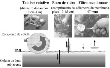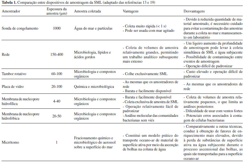 Hühnerfuss efetuou a revisão de algumas técnicas de amostragem pouco dispendiosas.27 Recentemente foram realizadas comparações sistemáticas das técnicas de amostragem da SML destinadas à investigação das propriedades microbiológicas,15,28 das especificidades e limitações de diversos amostradores,29-31 e das estratégias de preservação de amostras após coleta.32 A adsorção seletiva de bactérias, causando sobre-estimativas desses microrganismos na SML, têm sido apontada como a principal limitação da amostragem com membranas. Agogué et al. demonstraram que a malha de rede e a placa de vidro são apropriadas para amostrar vírus e bactérias quer totais, quer cultiváveis, e ainda para investigar a atividade bacteriana e a estrutura da comunidade microbiana.29 Num estudo recente foi constatado que as membranas de policarbonato flutuantes são a melhor técnica para detetar diferenças nas estruturas microbianas entre a SML e a água subjacente.15 Tais diferenças não puderam ser observadas em amostras da SML coletadas em placa de vidro ou rede de malha.21,22 As distintas especificidades e eficiências de coleta de cada uma das várias técnicas estão na origem das diferenças observadas.28 As amostragens com placa de vidro ou rede de malha são apropriadas para a caracterização química da SML, mas a sua utilização é difícil quando se pretende estudar parâmetros microbiológicos.33,34 Apesar da existência de diversas técnicas, a caracterização integral das amostras de SML constitui ainda um desafio, devido à heterogeneidade física, química e biológica. Em resultado da movimentação das ondas, a espessura da SML depende da velocidade do vento. Assim, a composição química pode ser rapidamente alterada, sobretudo em áreas onde a tensão superficial é maior. A coleta de amostras de SML reprodutíveis e representativas é também um repto, porque a utilização e operação dos dispositivos de coleta requerem experiência do utilizador, sobretudo com estados de mar mais alterados.35 Além disso, diferentes técnicas conduzem à amostragem de microcamadas de espessura e seletividade variáveis.15,32,34,35 Normalmente, a coleta envolve a imersão e rápida retirada do dispositivo de amostragem, permitindo a obtenção de apenas alguns mL em cada operação. Assim, o período de amostragem pode tornar-se demasiado longo quando se pretende obter um volume de SML adequado para certas análises, como é o caso da determinação de poluentes em concentrações vestigiais. Apesar das técnicas de amostragem mais habituais recorrerem à placa de vidro, rede de malha ou membranas, todas elas apresentam vantagens e desvantagens. A comunidade científica internacional discute ainda a adoção de protocolos de amostragem padronizados que tornem comparáveis os resultados das distintas pesquisas.