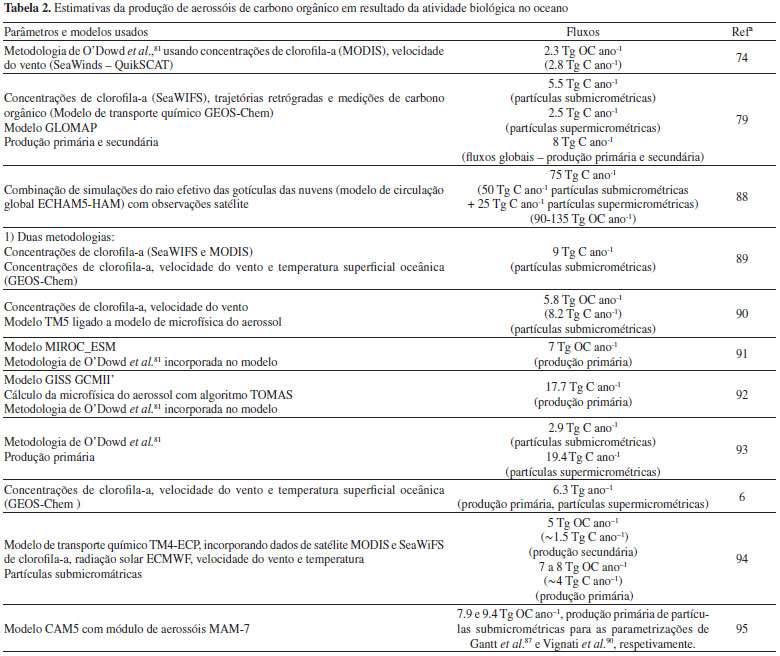 na qual u10 é a velocidade do vento 10 m acima da superfície do mar. Muitas parametrizações para W derivam de fotografias e vídeos da superfície oceânica obtidos em torres, aeronaves ou navios. Uma compilação detalhada dos vários estudos pode ser encontrada em Anguelova e Webster.248 Para velocidades de vento < 3 m s-1, a fração da superfície oceânica coberta por manchas de espuma é considerada nula.266 Os fluxos de produção de aerossol por unidade de área coberta com espuma têm sido estimados quer a partir de medições oceânicas, quer a partir de estudos laboratoriais.233,236,245,250,267-272 As vantagens das medições laboratoriais estão relacionadas com a possibilidade de controlo das condições ambientais. Porém, não é fácil simular condições realmente representativas do oceano aberto, tais como ondas bem desenvolvidas e ventos fortes.252 A abordagem mais correta é estimar in situ a produção direta de aerosol a partir das espumas brancas no oceano. No entanto, é difícil efetuar medições em oceano aberto perto da superfície e separar o aerossol gerado pela espuma branca do aerossol presente na atmosfera de fundo.252 Os contadores óticos de partículas têm sido usados para estudar as propriedades físicas dos aerossóis, mas são difíceis de instalar perto da superfície oceânica. Assim, grande parte das medições das concentrações numéricas do spray marinho foi efetuada a 5-25 m acima da superfície oceânica e depois interpoladas para um nível de referência (geralmente a superfície ou 10 m acima do nível médio do mar).252,260 O desenvolvimento tecnológico tem disponibilizado sensores cada vez menores, mais leves e mais baratos, permitindo realizar medições anteriormente impossíveis.273 Foram recentemente efetuadas medições sobre a zona de rebentação para estimar a produção de spray marinho.233,250 As medições na zona de rebentação possibilitam a colocação dos instrumentos em terra firme, mas, por outro lado, podem não ser representativas das espumas brancas observadas no mar alto. O espectro de tamanhos são muito diferentes para bolhas de raio > 50 µm, pelo que, na zona de rebentação, as concentrações numéricas podem ser duas ordens de grandeza superiores às registradas em mar alto.274 Enquanto no oceano aberto o rebentamento das ondas é forçado pelo vento e pela interação onda-onda, o processo na zona de rebentação resulta da interação com o leito do mar. Contudo, alguns pesquisadores observaram que os espectros dos aerossóis produzidos na zona de rebentação e no oceano aberto são similares.259 Norris et al. mediram o espectro do aerossol próximo da superfície de espumas brancas em mar alto, no Atlântico Norte, deduziram fluxos de produção de spray marinho por unidade de área de espuma e efetuaram estimativas dos fluxos médios para essa fonte.252 Grythe et al. efetuaram a revisão de 21 "funções fonte" reportadas na literatura para o spray marinho, algumas das quais são usadas em modelos climáticos, e propuseram uma nova parametrização.244 Dependendo da função usada, as estimativas realizadas variaram de 3 a 70 Pg ano-1. Ao compararem as estimativas com observações em várias estações de monitoramento, os autores concluíram que o melhor ajuste é conseguido quando se considera que a produção de spray de sal marinho é proporcional a u103.5. Uma forte influência da temperatura da superfície oceânica na produção de spray marinho foi também observada. A nova função, que inclui velocidade do vento e temperatura da superfície oceânica, proposta pelos autores, conduziu a estimativas de 9 Pg ano-1, correlacionando-se relativamente bem com as concentrações observadas. Recentemente, foi desenvolvida uma outra "função fonte", combinando medições de concentrações numéricas do aerossol em Mace Head (costa da Irlanda) com fluxos medidos em alto mar pelo método de covariância dos vórtices durante o cruzeiro SEASAW.275 Em vez da típica velocidade do vento a 10 m, a nova função parametriza a produção de partículas em função do número de Reynolds, restringindo, assim, as influências da altura das ondas e da viscosidade do mar, a qual depende da temperatura da superfície oceânica e da salinidade. Embora os valores dos fluxos obtidos com a nova função se situem no limite inferior de outras estimativas recentemente publicadas, ajusta-se bem aos dados experimentais da fração submicrométrica de spray marinho medidos em Mace Head. Muitos modelos à escala global já incorporam as "funções fonte" para a produção de spray marinho.234,276,277 Comparativamente, poucos estudos foram aplicados à escala regional com alta resolução.278 O número limitado de medições da composição química do aerossol limita, no entanto, a validação desses modelos. Fluxos de poluentes orgânicos As parametrizações para estimar os fluxos oceano-atmosfera para poluentes orgânicos, como os poluentes orgânicos persistentes (POPs) (e.g. bifenilos policlorados, PCBs) e PAHs, têm sido diretamente adaptadas dos estudos de transferência de CO2 na interface entre os dois compartimentos. As propriedades físico-químicas específicas desses poluentes tornam, no entanto, necessária a obtenção de dados experimentais que clarifiquem os mecanismos envolvimentos no seu transporte.279 As transferências gasosas através da interface oceano-atmosfera podem ser descritas por um modelo clássico de bicamada,280 o qual tem sido aplicado às trocas de poluentes orgânicos através dessa interface.279,281 O fluxo F (ng m-2 dia-1) do poluente através da interface oceano-atmosfera pode ser determinado a partir do coeficiente de transferência mássica (Kol), que descreve o transporte e o gradiente de concentração entre a mistura e a fase gasosa: