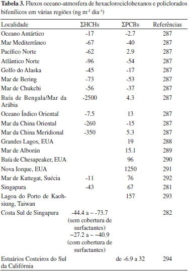 sendo Sc o número de Schmidt, nkin a viscosidade cinemática (cm2 s-1) e D a difusividade (cm2 s-1) da água do mar. As trocas através da interface oceano-atmosfera de compostos orgânicos semivoláteis foram estudadas por He e Balasubramanian em regiões costeiras de Singapura.282 O primeiro cenário estudado foi uma superfície marinha sem cobertura por surfactantes. Todos os PAHs apresentaram fluxos negativos, indicando a transferência desses poluentes da atmosfera para o oceano (absorção líquida). Os fluxos de ΣPAH atingiram valores de -5884.0±2167.6 ng m-2 dia-1. A cobertura da superfície marinha com surfactantes reduziu os fluxos de ΣPAH para valores até -3340.1±1431.7 ng m-2 dia-1. A magnitude dos fluxos de PAHs reportada para Singapura é semelhante à descrita para um lago urbano em Guangzhou, China (-0.01~-21.2 µg m-2 dia-1).283 Quer o porto de Nova Iorque, quer a baía de Raritan (entre Nova Iorque e Nova Jersey) apresentaram fluxos de volatilização para a maioria dos PAHs.284 No porto de Mumbai, foram registrados fluxos positivos para os PAHs de baixo peso molecular, enquanto os compostos de elevado peso molecular produziram fluxos negativos.285 Usando as concentrações de PAHs observadas na água do mar e na SML em regiões costeiras do NW do Mediterrâneo e tendo por base o modelo clássico de bicamada,280 Guitart et al. estimaram os fluxos difusivos entre a superfície oceânica e a atmosfera.279 Os fluxos ar-SML de PAHs totais (Σ15) variaram de 411 a 12,292 ng m-2 dia-1 (absorção) e de -506 a -13,746 ng m-2 dia-1 (volatilização). O transporte de PAHs na fase particulada foi estimado a partir da análise de aerossóis atmosféricos e de armadilhas programadas para capturar material particulado durante o processo de sedimentação. Os fluxos de deposição atmosfera-oceano dos PAHs totais variou de 13 a 114 ng m-2 dia-1 e os fluxos de sedimentação no oceano (nos primeiros 5 m de coluna de água) oscilaram de 184 a 323 ng m-2 dia-1. Os resultados desses estudos indicam que a magnitude e direção dos fluxos através das SML podem ser subestimadas ou sobrestimadas quando ocorre, respetivamente, enriquecimento ou depleção de PAHs por volatilização, se as concentrações nas águas subjacentes são usadas nas equações de trocas gasosas ar-oceano. Esses fenómenos são designados por "efeitos de encapsulamento dos fluxos", i.e., alteração dos fluxos de volatilização ou absorção de um composto químico pelo oceano devido à ocorrência variável de um enriquecimento ou depleção da concentração desse composto na SML. Pensa-se que esses efeitos também ocorrem com os gases de efeito estufa (e.g., CO2, CH4).279 Porém, as grandes inconsistências verificadas nas estimativas de fluxos de PAHs em regiões costeiras, sobretudo devidas às incertezas associadas a vários parâmetros, requerem medições adicionais e outras abordagens experimentais, incluindo um aprimoramento das parametrizações. Em primeiro lugar, o cálculo de fluxos é baseado nos seguintes pressupostos gerais: i) não há perdas de PAHs quer na forma particulada, quer dissolvida (e.g. via degradação, reações fotoquímicas ou transporte advectivo) e ii) existência de condições de estado estacionário. A hipótese de estado estacionário não é inteiramente correta, visto que os parâmetros ambientais são dinâmicos, sofrendo alterações constantes. O uso exclusivo da velocidade do vento para prever a velocidade de transferência apresenta falhas substanciais, originando erros sistemáticos. Por outro lado, o próprio cálculo dos fluxos inclui várias aproximações e simplificações implícitas nos parâmetros utilizados.279 Os fluxos oceano-atmosfera de Σ35PAHs foram estimados para uma área no Mediterrâneo oriental tendo por base os gradientes de concentração medidos em amostras de água do mar e em amostras atmosféricas.286 Os fluxos totais de deposição conduziram a um valor médio de -1940 ng m-2 dia-1. Os valores negativos indicam que o processo dominante é a absorção dos PAHs pela coluna de água. A magnitude dos fluxos de PAHs varia sazonalmente, dependendo das velocidades do vento, das temperaturas e dos gradientes de concentração água-ar. Sabe-se que os POPs, incluindo os compostos organoclorados, se encontram substancialmente enriquecidos (até 100 vezes) na SML das regiões costeiras com relação às águas subjacentes.121 Os efeitos da SML nos fluxos oceano-atmosfera de POPs têm sido amplamente desprezados devido às dificuldades de quantificação quer desses compostos, quer das alterações nas propriedades da SML causadas por parâmetros ambientais. Realizando medições simultâneas de PCBs e de isómeros do hexaclorociclohexanos (HCHs) na água do mar, SML e atmosfera e usando um modelo de bicamada modificado, Wurl et al. estimaram fluxos médios de ΣPCBs e ΣHCHs de 67.2 e -43.1 ng m-2 dia-1, respectivamente.281 Iwata et al. reportaram fluxos negativos de HCHs em todas as regiões oceânicas estudadas, indicando adsorção líquida no oceano desses compostos.287 Altos fluxos de adsorção têm sido reportados para o mar da China Oriental e Sul, Golfo de Bengala e mar da Arábia. Porém, esses valores foram obtidos antes ou durante a implementação de regulamentos a restringir o uso de HCHs na India e na China. Pensa-se que, atualmente, os valores sejam substancialmente menores, tal como descrito numa recente campanha de medições de POPs levada a cabo no oceano Índico.281 A Tabela 3 apresenta uma compilação de valores de fluxos obtidos nessas e noutras regiões.