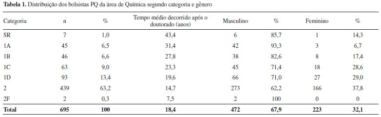 RESULTADOS E DISCUSSÃO Dos 695 bolsistas PQ da área de Química, 674 (97,0%) atualizaram o currículo Lattes em 2012, sendo que 535 (77,0%) deles nos últimos 3 meses considerando a data de coleta dos dados. 690 (99,3%) dos bolsistas declaram a área de Química como a sua principal área de atuação. Os demais bolsistas (5), 2 declararam atuar na área de Física, 1 em Bioquímica, 1 em Farmácia e o outro não informou. Dentre as mais de 200 diferentes subáreas de atuação informadas nos currículos Lattes dos bolsistas, as que mais se destacaram foram: físico-química (40,1%), química orgânica (38,8%), química analítica (30,6%) e química inorgânica (25,2%). Na Tabela 1 é apresentada a distribuição dos bolsistas em cada uma das categorias e por gênero. Pode-se observar que a maioria é do sexo masculino (67,9%) e se concentra na categoria 2 (63,2%). Também é possível observar que há um predomínio masculino em todas as categorias, principalmente nas categorias SR e 1A. Isso é esperado tendo em vista o predomínio masculino na titulação e na carreira universitária há algumas décadas passadas.