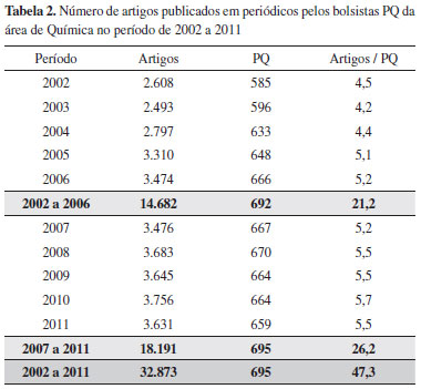 Analisando o número de bolsistas por milhão de habitantes, o grande destaque é o estado do Rio Grande do Sul (6,8) que possui quase o dobro de bolsistas por milhão de habitantes quando comparado com a média do país que é de 3,6. Ainda na região Sul, o estado de Santa Catarina (4,8) também está acima da média. Na região Sudeste, é interessante observar que todos os estados, com exceção do Espírito Santo, estão acima da média nacional de bolsistas por milhão de habitantes. Na região Nordeste, os estados de Sergipe (5,3) e da Paraíba (3,7) também estão acima da média nacional. Na região Centro-Oeste, o Distrito Federal (5,1) também se encontra nessa condição. Os bolsistas da categoria SR estão concentrados na região Sudeste, sendo que apenas 1 (14,3%) do total de 7 está na região Sul. Os bolsistas da categoria 1A estão um pouco mais distribuídos. Apesar da grande maioria (71,1%) estar na região Sudeste, também há bolsistas nas regiões Sul (17,8%) e Nordeste (11,1%). Os bolsistas da categoria 1B também se concentram na região Sudeste (76,1%). O mesmo ocorre com os bolsistas da categoria 1C (69,8%) e com os bolsistas da categoria 1D (60,2%). Já os bolsistas da categoria 2 estão distribuídos em 20 estados mais o Distrito Federal e a maioria (56,3%) também se encontra na região Sudeste. Os bolsistas da categoria 2F estão na região Nordeste (50,0%) e Sul (50,0%). No endereço profissional os bolsistas também informam a instituição em que trabalham. São 77 instituições diferentes sendo que as 5 mais informadas são: Universidade de São Paulo (104), Universidade Estadual de Campinas (56), Universidade Federal de Minas Gerais (43), Universidade Federal do Rio de Janeiro (42) e Universidade Estadual Paulista Júlio de Mesquita Filho (40). Todas essas instituições estão na região Sudeste e representam pouco mais de 40% dos bolsistas PQ da área de Química. Na região Sul, a Universidade Federal do Rio Grande do Sul está na sexta posição com 37 bolsistas. Na região Nordeste, a Universidade Federal do Ceará é a instituição melhor colocada ocupando a nona posição com 23 bolsistas. Na região Centro-Oeste, a instituição melhor colocada é a Universidade de Brasília que ocupa a décima quarta posição com 13 bolsistas. E na região Norte, a Universidade Federal do Pará é a instituição melhor colocada ocupando a trigésima sexta posição com 3 bolsistas. É interessante destacar também que mais da metade (55,6%) dos bolsistas da categoria 1A trabalha na Universidade de São Paulo ou na Universidade Estadual de Campinas. Dos 695 bolsistas, 688 (99,0%) informaram ter conhecimento de idiomas (total de 19 diferentes), sendo que Inglês (98,8%), Espanhol (77,8%) e Francês (49,9%) foram os três principais. Dos 687 bolsistas que declararam ter conhecimento no idioma "Inglês", 358 (52,1%) declararam ler, escrever, falar e compreender bem. Desse total, 203 (56,7%) são da categoria 2 e 32 (71,1%) dos 45 bolsistas da categoria 1A também declaram ter esse conhecimento. O número de artigos publicados em periódicos no período de 2002 a 2011 foi de 32.873 artigos, conforme destacado na Tabela 2. Dividindo esse período em dois períodos de 5 anos, percebe-se que houve um aumento de 23,9% no número de artigos publicados em periódicos entre o período de 2002 a 2006 e o período de 2007 a 2011. A média de artigos por ano de cada um dos 695 bolsistas foi de 4,7.