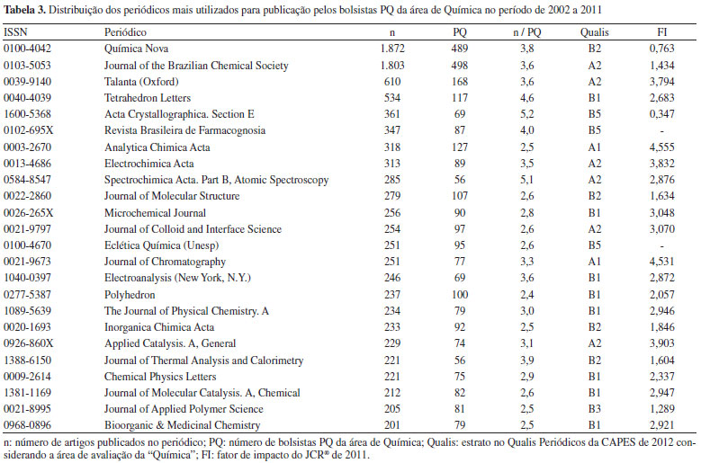 Do total de publicações em periódicos no período de 2002 a 2011, 31.876 (97,0%) artigos possuíam ISSN. A Tabela 3 apresenta a lista dos periódicos com mais de 200 artigos no período de 2002 a 2011 mais utilizados para publicação nesse período, obtidos a partir dos ISSN indicados. Nesse período, os bolsistas publicaram em 1.979 periódicos diferentes. Assim também foi possível obter o estrato do periódico de acordo com o Qualis/CAPES de 2012, considerando a área de avaliação da "Química". Também foi possível obter o fator de impacto dos periódicos correspondentes no JCR® de 2011.