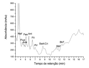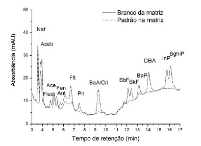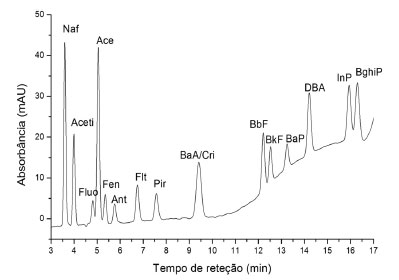 ![]() Figura 4. Representação do cromatograma das análises realizadas por CLAE-UV de solução padrão de HPAs preparadas em extratos orgânicos de amostras de lodo obtidos pela técnica Soxhlet
