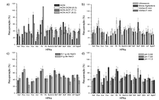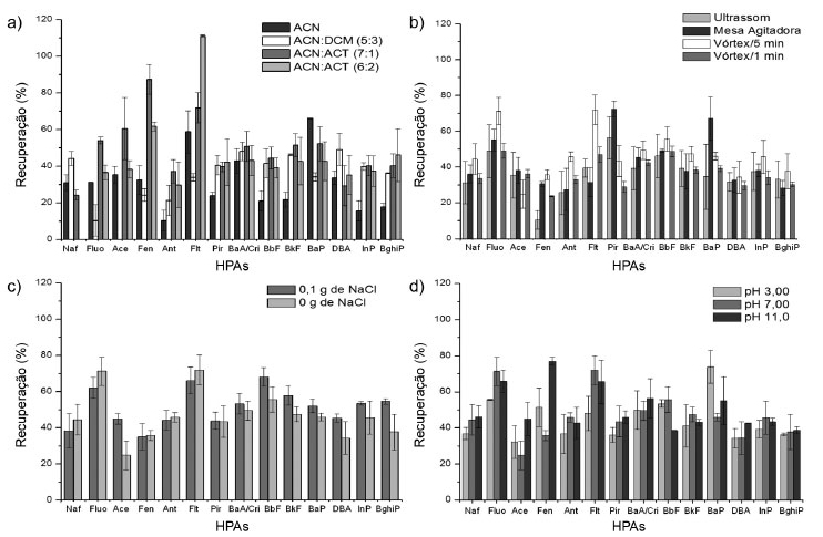 O comprimento de onda 224 nm foi monitorado espectrofotometricamente para cada solução de 5,00 mg L-1 de HPA, apresentando absorbância similar para maior parte destes. Esse comprimento de onda também foi adotado em trabalhos anteriores.6,26 Nessas condições cromatográficas, os HPAs de menor cadeia (Naf, Aceti, Fluo, Ace, Fen, Flt e Pir) foram separados em oito minutos com a proporção de fase móvel com 22,0% de água e 78,0% de acetonitrila. Já os HPAs BbF, BkF, BaP, DBA, InP e BghiP foram separados com a fase móvel constituída de 100% de ACN e redução da taxa de fluxo da fase móvel. Os compostos Cri e BaA foram estudados como um único sinal na otimização do método. Entretanto, uma condição especial foi desenvolvida para confirmar a presença de cada composto e quantificá-los individualmente. Solução padrão contendo apenas estes dois analitos foi analisada por CLAE-UV, com fluxo isocrático de 1,40 mL min-1 e 100% de ACN, sendo que Cri e BaA apresentaram tempo de retenção de 1,30 e 2,22 minutos, respectivamente. Trabalhos anteriores têm relatado a dificuldade em analisar HPAs por CLAE utilizando colunas cromatográficas com 15 cm de comprimento, pois mostraram a separação e quantificação de apenas 12 dos 16 HPAs.24,26 Otimização da ESL-PBT As porcentagens de extração de 15 HPAs em cada uma das condições otimizadas são mostradas na Figura 2a-d. O HPA Aceti foi excluído das análises por apresentar tempo de retenção igual a um interferente extraído da matriz lodo de esgoto de sinal intenso. A interpretação detalhada da Figura 2 será discutida posteriormente no artigo.