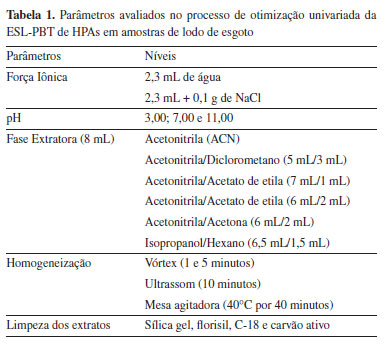 | Otimização e validação da extração sólido-líquido e purificação em baixa temperatura de HPAs em lodo de esgoto Optimization and validation of solid-liquid extraction and purification at low temperature of PAHs in sewage sludge |