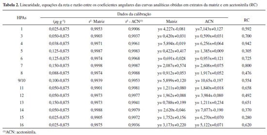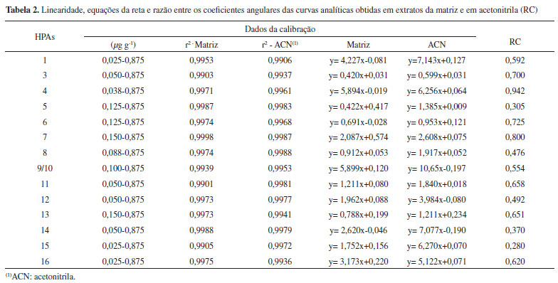 Procedimento Para a otimização da técnica de ESL-PBT, amostras de lodo de esgoto (4,0000 g) foram fortificadas com 100,0 µL da solução de trabalho contendo 16 HPAs e deixadas em repouso por três horas. À amostra fortificada foram adicionados 2,3 mL de fase aquosa e 8,0 mL de mistura extratora (Tabela 1). O sistema foi homogeneizado e, em seguida, mantido a -18 ºC por uma hora para o completo congelamento da fase aquosa. A fase líquida do sistema bifásico foi vertida em uma coluna de vidro (20 cm x 1,5 cm diâmetro interno) contendo 2,0000 g de adsorvente (Tabela 1). O fluxo foi controlado para 0,5 mL min-1 e os extratos obtidos foram recuperados em balão de 5,0 mL utilizando acetonitrila como eluente. Em seguida, 0,3 mL foram filtrados em membrana de nylon 0,45 µm e armazenados a 4 ºC até o momento das análises por CLAE-UV. Extração por Soxhlet Amostras de 20,0000 g de lodo de esgoto foram fortificadas, deixadas em repouso e submetidas à dessulfuração com cobre metálico ativado em ácido clorídrico a 10% (v/v). A extração e a limpeza dos extratos foram realizadas segundo o protocolo da EPA (métodos 3540C e 3630).21,22 As amostras foram transferidas para cartuchos de celulose e submetidas à extração em Soxhlet durante 24 h com 250 mL de acetona/diclorometano (1:1, v/v) a 80,0 ºC. Os cartuchos foram previamente lavados seguindo o mesmo procedimento no Soxhlet. Os extratos foram concentrados e recuperados em 5,00 mL no evaporador rotatório (Quimis, São Paulo) a 55,0 ºC. Para a limpeza dos extratos, o concentrado foi vertido em uma coluna de vidro (25 cm x 1,5 cm de diâmetro interno) empacotada com 3,00 cm de alumina, seguida por 10,0 cm de sílica e 2,00 cm sulfato de sódio anidro. Posteriormente, 20,0 mL de diclorometano foram utilizados para a eluição. A fração recolhida foi concentrada e recuperada para 0,50 mL em acetonitrila. Validação do método As figuras de mérito da ESL-PBT como seletividade, limite de detecção (LD), limite de quantificação (LQ), linearidade do método, precisão e exatidão foram avaliadas conforme sugerido pelo protocolo do Instituto Nacional de Metrologia, Normalização e Qualidade Industrial - INMETRO, 2010.23 A análise de variância e o teste de amplitudes múltiplas de Duncan (a 5% de probabilidade) foram realizados para verificar a existência de diferenças significativas entre as variáveis otimizadas. Avaliação do efeito de matriz Para avaliar o efeito de matriz nas análises por CLAE-UV foram construídas duas curvas analíticas contendo os 16 HPAs, sendo uma em solvente puro (ACN) e outra no extrato da matriz. Das curvas analíticas foram obtidas as equações da reta por regressão linear utilizando o método dos mínimos quadrados. Os efeitos produzidos pelos componentes da matriz foram avaliados pela razão entre os coeficientes angulares obtidos de cada HPA na matriz e os coeficientes angulares obtidos em acetonitrila.
