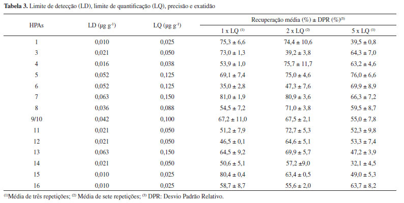 Alguns estudos que envolvem desenvolvimento de método utilizam lodo sintético obtidos de empresas certificadas.2 Nesses casos, não ocorre detecção de interferentes da matriz, favorecendo a seletividade do método. No entanto, há um custo considerável de aquisição e não representa qualitativamente o lodo de esgoto real. Limite de detecção e quantificação Os valores de limites de detecção (LD) e quantificação (LQ) para o método proposto foram determinados considerando três e dez vezes a intensidade do sinal do ruído. Os resultados encontrados estão apresentados na Tabela 3. O LQ obtido para os HPAs, exceto benzo[a]antraceno e benzo[a]pireno, foi menor que os valores regulamentados para HPAs no solo, conforme a Resolução CONAMA nº 375 de 2006. Vale destacar que a soma das concentrações no limite de quantificação obtidas para os 15 HPAs (Σ = 1,05 mg kg-1) foi inferior às concentrações máximas estabelecidas pela União Europeia para lodo de esgoto (6,0 mg kg-1 a soma de 11 HPAs).