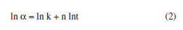 Construindo-se um gráfico de ln de α em função de ln de t (Figura 6a e 6b) foi possível determinar os valores do expoente de difusão (n) e da taxa aparente de liberação (k) a partir dos coeficientes angulares e lineares, respectivamente, da porção reta chamada faixa de aplicabilidade.26