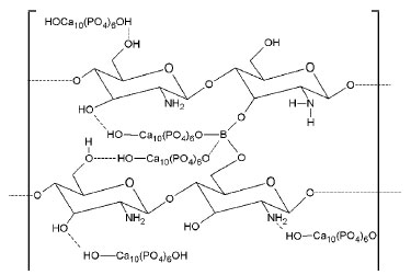 ![]() Figura 1. Ligações de hidrogênio entre quitosana e hidroxiapatita (---) e interações do Bórax no processo de reticulação do material ESC-Quit, adaptado das referências 32 e 33