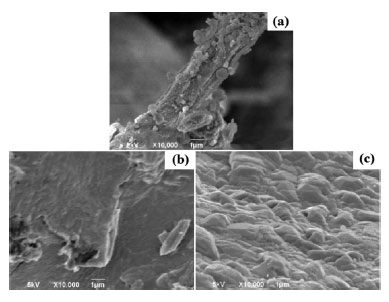 ![]() Figura 2. Micrografia da escama de peixe (a), dos materiais ESC-Quit (b) e ESC-Quit-B (c)