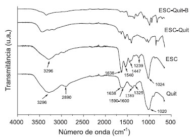 Enquanto o material ESC-Quit apresenta uma superfície mais uniforme, o material ESC-Quit-B apresenta uma superfície completamente rugosa com inúmeros aglomerados que podem ser atribuídos aos cristais de Bórax que permanecem na superfície do material, mesmo após várias lavagens com água bidestilada. Segundo a literatura,12 o aumento de porosidade é um parâmetro muito importante para melhorar o processo de liberação de herbicidas. Os espectros dos materiais de partida (Quit e ESC) e dos materiais ESC-Quit e ESC-Quit-B são apresentados na Figura 3. O espectro da quitosana (Quit) apresenta bandas em 1020, 1325 e 1380 cm-1 que correspondem às vibrações de estiramento da ligação C-O-C, vibrações de estiramento de grupos amina (C-N) e deformação simétrica angular do grupo CH3, respectivamente.37,38 A banda larga em torno de 1590-1600 cm-1 corresponde às vibrações do grupo -NH2, e a banda em 1638 cm-1 é característica das vibrações de estiramento do grupo C=O (amida I), o que evidencia que a quitosana é um produto parcialmente desacetilado.39-41 A banda em 2891 cm-1 corresponde à vibração de estiramento do grupo C-H. A larga banda em torno de 3000-3600 cm-1 com intensidade máxima em 3296 cm-1 é atribuída às vibrações de estiramento axial dos grupos OH e aparece sobreposta à banda de estiramento dos grupos N-H e ligações de hidrogênio do polissacarídeo.37,40,41