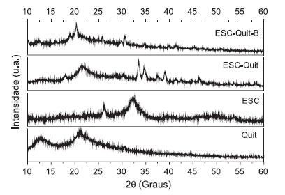 No espectro de absorção do material ESC é possível observar uma banda em 1024 cm-1 que corresponde à vibração do grupo fosfato (PO43-) presente na estrutura da hidroxiapatita.32,42 A banda em 1239 cm-1 é atribuída à amida III presente no colágeno e surge devido às vibrações de estiramentos dos grupos C-N e N-H.40,41 Uma banda em 1447 cm-1 é atribuída às vibrações dos grupos CO32-. De acordo com os dados encontrados na literatura, sítios PO43- presentes na estrutura da hidroxiapatita podem sofrer substituição por grupos CO32-.32,42,43 As bandas em 1540 e 1638 cm-1 são atribuídas aos estiramentos dos grupos N-H da amida II e C=O da amida I, respectivamente, grupos que estão presentes na estrutura do colágeno.40,41 Uma larga banda em 3100-3600 cm-1, com intensidade máxima em 3296 cm-1 é atribuída às vibrações dos estiramentos dos grupos -OH, provenientes da estrutura da escama, assim como da água adsorvida no material.40,44 No espectro do material ESC-Quit é possível observar bandas em 852 e 1066 cm-1 referentes ao estiramento do grupo P-OH e às vibrações dos grupos fosfato (PO43-), presentes na estrutura da hidroxiapatita.44-46 As bandas em 1410 e 1453 cm-1 correspondem às vibrações dos grupos CO32-.42,43 A banda correspondente às vibrações da amida II não sofreu deslocamento significativo. A larga banda em torno de 3100-3600 cm-1 com intensidade máxima em 3455 cm-1 está relacionada às sobreposições das vibrações de estiramento dos grupos -NH2 e -OH.40,41 O espectro do material reticulado ESC-Quit-B apresenta bandas em 710, 821 e 1472 cm-1 que podem ser atribuídas às vibrações dos grupos CO32-.42 As bandas em 944, 999 e 1123 cm-1 estão relacionadas aos estiramentos simétricos e assimétricos dos grupos fosfatos presentes na hidroxiapatita.44 Foram observados grandes deslocamentos das bandas relacionadas a amida I, II e III e da banda relacionada ao grupo fosfato (999 cm-1), o que evidencia possíveis ligações entre a hidroxiapatita e o colágeno (presentes na escama) e a quitosana. Observa-se que a banda correspondente às vibrações dos grupos -NH2 surge bem menos intensa e mais larga. A banda em 1349 cm-1 pode estar relacionada às vibrações dos grupos CH3.37 A intensa redução da banda em torno de 3100-3600 cm-1 deixa evidente que a reticulação com o Bórax também ocorreu através de interações com os grupos -OH do polissacarídeo e da hidroxiapatita. Este fato é consistente com dados encontrados na literatura.47 Na Figura 4 são apresentados os difratogramas dos materiais Quit, ESC, ESC-Quit e ESC-Quit-B. O padrão de raios X da quitosana pura apresenta uma difração próxima a 2θ menos intensa em torno de 12,8º e uma difração de alta intensidade em torno de 21,0º, correspondentes as planos de difração (020) e (110), respectivamente.20,40 O difratograma da escama de peixe apresenta halos em 26,3º e 32,3º que correspondem ao plano de difração (002) e (300) da fase cristalina da hidroxiapatita.22