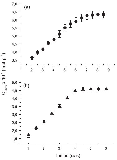 onde Ceq(lib) corresponde às concentrações de equilíbrio, em mol L-1, determinadas após a liberação dos herbicidas em tempos pré-determinados, V é o volume do solvente no processo de liberação em litro (L) e m corresponde à massa, em gramas, dos materiais. As quantidades liberadas dos herbicidas impregnados no material ESC-Quit-B, em função do tempo, podem ser observadas na Figura 5. É possível observar que a liberação do herbicida atrazina ocorreu em torno de 7 dias (Figura 5a).
