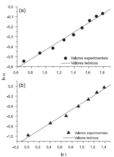 ![]() Figura 6. Gráfico de ln α em função de ln t mostrando a faixa de aplicabilidade do processo de liberação da atrazina (a) e diuron (b) impregnados no material ESC-Quit-B
