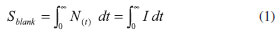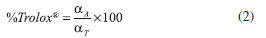 Antiradical compounds trap radicals, thereby resulting in suppression of the emission intensity. The difference between the areas obtained in the absence and the presence of these compounds-suppression area-is proportional to the number of consumed radicals and, consequently, to the antiradical concentration and its radical scavenging capacity (Figure 1S). This methodology also allows for the determination of the TRAP values for complex natural product mixtures used in chemiluminescence assays. A linear correlation between the suppression area and the antiradical concentration can be used to furnish the TRAP value corresponding to the concentration of mixture responsible for the same suppression area as that caused by 1.0 µmol L-1 of Trolox® (Figure 2S). Additionally, the antiradical capacity of complex mixtures can be obtained from the slopes (α) of the linear correlations of the suppression area with antiradical concentration (αA) and the Trolox® concentrations (αT) (Figure 2S). This value obtained from these parameters (Equation 2) expresses the antiradical capacity directly in Trolox® percentage (%Trolox®).