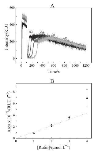 ![]() Figure 1. A: Emission intensity decay kinetics of the luminol/hemin/H2O2 system at different [Rutin]: (a) [Rutin] = 1.0 µmol L-1, (b) [Rutin] = 2.0 µmol L-1, (c) [Rutin]= 3.0 µmol L-1 and (d) [Rutin] = 4.0 µmol L-1; B: Linear correlation between the suppression area and the rutin concentration. Area = (1.08±0.08) 104 × [Rutin]; R2 = 0.97322