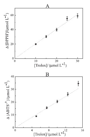 ![]() Figure 2. Linear correlation between the change in [DPPH•] or [ABTS•+] and the change in [Trolox®]. A: Δ[DPPH•] = (2.04 ± 0.05) × [Trolox®], R2 = 0.99786; B: Δ[ABTS•+] = (2.04 ± 0.05) × [Trolox®], R2 = 0.99179