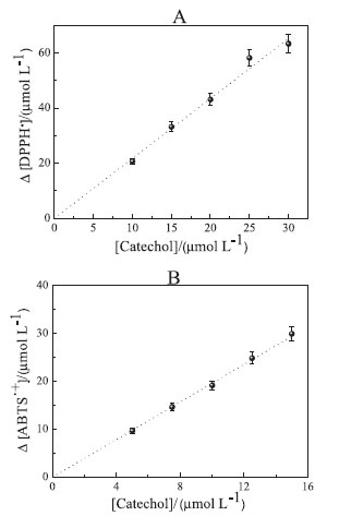 ![]() Figure 3. Linear correlation between the change in [DPPH•] or [ABTS•+] and the change in [catechol]. A: Δ[DPPH•] = (2.17 ± 0.05) × [Catechol], R2 = 0.99792. B: Δ[ABTS•+] = (1.96 ± 0.04) × [Catechol], R2 = 0.9985