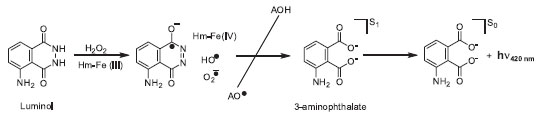 ![]() Scheme 1. Chemiluminescent oxidation of luminol in alkaline aqueous medium in the presence of an antiradical compound