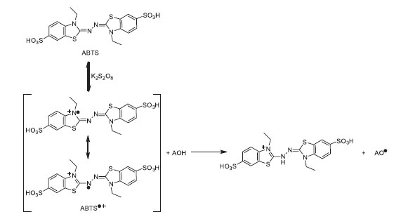 ![]() Scheme 3. Oxidation of ABTS by potassium persulfate to generate radical cation ABTS•+ and its reaction with an antiradical compound (AOH)
