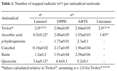 IDepartamento de Química Fundamental, Instituto de Química, Universidade de São Paulo, Av. Prof. Lineu Prestes, 748, Bloco 12 Superior, 05508-000 São Paulo - SP, Brasil Recebido em 12/09/2013 *e-mail: wjbaader@iq.usp.br The efficiency of the chemiluminescence luminol method and colorimetric DPPH and ABTS methods in evaluating the antiradical capacity of pure compounds and plant extracts with antioxidant potential is compared. In case of pure compounds, the values of parameter 'n' (number of radicals quenched per molecule of antiradical) for ascorbic acid, p-hydroquinone, catechol, quercetin, and rutin are similar when measured by colorimetric assays; however, considerably lower values of n are obtained with the luminol assay. The antiradical activity of extracts from male and female individuals of Baccharis burchelli and Baccharis crispa were determined by the luminol assay and expressed using the new Troloxr percentage (%Troloxr) parameter. INTRODUCTION Antioxidants are substances that, at relatively low concentrations, prevent, delay, or repair oxidative damages to targeted molecules. In biological systems, excess antioxidants can interfere with reactive oxygen species (ROS)-dependent signal transduction.1,2 Proteins, enzymes, and other organic molecules such as vitamin E, ascorbic acid, and carotenoids can act as antioxidants in biological systems. Phenolic compounds, including flavonoids and carotenoids, present in the human diet, mainly in fruits and vegetables, are widely recognized as antioxidants as they are capable of avoiding diseases caused by oxidative stress, such as cardiovascular disorders, cancer, neurodegenerative diseases, and premature aging. The antioxidant action of these compounds results from their capacity to reduce ROS such as hydroxyl (HO), peroxide (ROO), superoxide (O2-), alkoxyl (RO) and hydroperoxyl (HOO) radical species, as well as, singlet oxygen (1O2, Δg) by donation of a hydrogen atom or an electron.3-5 Several methods for determining the total antioxidant capacity of pure substances and mixtures have been developed, and the importance of identifying the source of oxidative stress, the exact reaction mechanism as well as the chemical nature of the target attacked by the oxidizing species has been pointed out.6 However, most antioxidant assays developed utilize a specific radical reaction which is inhibited by the addition of a potential antioxidant compound. This chemical reaction in the assay is in general very different from the reactions of radical species generated in biological systems and the targets of these radical (detection system) are also different from the ones important in vivo.2 Therefore, the "total antioxidant capacity" measured for pure compounds using these methods is better represented by "total antiradical capacity" to accurately reflect the determined capacity of the compound to interfere in a radical reaction. This ability is not necessarily the same as the antioxidant activity in vivo, as defined above. In this sense, we use the term "antiradical capacity" henceforth for the parameter determined with "chemical" in vitro assays, and this capacity may also be understood as a "potential antioxidant capacity". The term "antiradical" is used here also for parameters where the authors of the specific assay denominate the parameter as "antioxidant". Wayner et al. developed the total peroxyl radical-trapping potential (TRAP) method, which evaluates the time necessary to consume all antiradical species present in a specific sample, to determine the total antiradical potential of plasma samples.7 This technique is based on the measurement of the induced time in a lipid peroxidation system where free radicals are produced with a constant rate using 2,2'-azobis(2-amidinopropane) (ABAP) as radical initiator.8 To monitor the rate of this process, the oxygen consumption by the system is measured, and 6-hydroxy-2,5,7,8-tetramethylcroman-2-carboxilic acid (Trolox®) is used as standard antiradical compound. This method has been utilized by researchers to evaluate the effect of different treatments on plasma antiradical capacity. Lissi et al. proposed an adaptation of the original TRAP assay based on the suppression of light emitted in a chemiluminescent reaction by the consumption of the radicals generated during this process.9 The chemiluminescent TRAP method is based on luminol oxidation using ABAP as a free radical source.8 The reaction between an antiradical compound and radicals inhibits the chemiluminescence emission for a time period, denominated induction time, which is proportional to the concentration of the additive and its antiradical capacity. This induction time is determined relative to that of the standard antioxidant Trolox®. Bastos et al. developed a chemiluminescent method using the luminol/hemin/ H2O2 system; the emission in this system is higher than that of the luminol/ABAP system8 and has a considerably lower response time.10 Additionally, in contrast to other methods, the antiradical capacity is determined by the suppression in the area of the light emission by the antioxidant, therefore allowing for the exact determination of the antiradical capacity of probes with different antiradical reactivities.10 This method can also be utilized for the determination of antiradical capacity of a complex mixture of potential antioxidants, wherein the antiradical capacity is expressed in mg L-1 of antiradical that corresponds to the suppression area equivalent to the addition of Trolox® 1.0 µmol L-1 (by analogy to the proposed practices in TRAP method for complex mixtures).11 Several other robust and reliable antiradical assays, based on the chemiluminescence emission of the luminol system, have been utilized for the determination of the antiradical activity of pure compounds and complex mixtures extracted from plants, including chalcones and natural lipids present in vegetable oils.12-14 The advantage of these chemiluminescenc