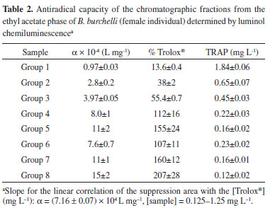The absolute n values (n*) obtained with the colorimetric assays can be compared directly to the parameter n obtained with the luminol method using the calibration with the standard Trolox® (Table 1). The values determined using different assays are significantly different in some cases. However, irrespective of the assay method, the general trend of the antiradical capacity is maintained. The n values obtained for ascorbic acid and p-hydroquinone by the colorimetric methods are reasonably similar and the value of the former agrees with the literature value (Table 1).31 No n value has been reported for p-hydroquinone. Similarly, while no n values have been reported for catechol and rutin, the n* values determined for these compounds in our study are similar and independent of the colorimetric assay. The n values obtained for quercetin, using either of the three methods, are similar. However, for other compounds, the values obtained with the luminol assay proved to be significantly lower than that obtained with the colorimetric assays, especially in the case of catechol (Table 1). This is likely due to the lower stability of these compounds in the basic aqueous medium utilized for the luminol assay, as compared to the neutral ethanolic media used in ABTS and DPPH assays. Determination of the antiradical capacity of mixtures The luminol chemiluminescence antiradical assay has also been utilized as a screening test to indicate possible antioxidant activity in extracts and chromatographic fractions obtained from plant material.10 As an additional example, we report here the determination of the antiradical capacity of chromatographic fractions of the ethyl acetate phase from B. burchellii (Table 2). The fractions obtained are subjected to the luminol assay and show a good linear correlation between the suppression area and sample concentration (Figure 4S). The antiradical capacity of these multi-component mixture fractions are conveniently expressed as %Trolox® values by comparing the slopes of the linear correlations between sample concentration (in mg L-1) and suppression area, and Trolox® concentration (also expressed in mg L-1) and suppression area. Such a comparison allows for the determination of antiradical capacity of any fraction (or extract) in terms of a hypothetical sample which contains only pure Trolox®. This means that a sample with a slope similar to that of Trolox® has the same antiradical capacity as that of pure Trolox®. The results obtained indicate significant differences in the antiradical capacities of the fractions, and it is evident that fractions 4-8 possess higher antiradical capacities than pure Trolox® (Table 2). The direct relationship between %Trolox® value and antiradical capacity facilitates the easy interpretation of the results; in contrast, the TRAP value, proposed formerly to express the capacity of mixtures,14,23,24 is inversely proportional to the antioxidant capacity (Table 2). Groups 3 and 4 were composed of ferulic and caffeic acid derivatives, respectively. The highly active group 5 proved to be an inseparable mixture, with 3,5-O-dicaffeoylquinic acid and 3-O-feruloyl-5-O-caffeoylquinic acid as major components. The isolation and characterization of these compounds will be reported elsewhere. Having established that the luminol assay can be utilized to determine the antiradical capacity of complex mixtures, we used this assay in the evaluation of hydroalcoholic extracts of B. burchellii and B. crispa. For the sake of comparison, the antiradical capacity of these extracts was also determined using the DPPH and ABTS assays and the capacity conveniently expressed as %Trolox® values (Table 3).