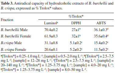 The obtained data indicate that the antiradical capacity of plant extracts can be determined using any of the three methods. However, the chemiluminescent luminol assay is considerably more sensitive as indicated by the significantly lower sample concentrations utilized in this assay as compared to the DPPH and ABTS assays. Actually, the sample concentration in the luminol assay is nearly an order of magnitute lower than that in the colorimetric assays (Table 3). In spite of the differences in the values of the antiradical capacity obtained by the three methods, the trends between the samples were internally similar (Table 3). The antiradical capacity of B. burchellii is higher than that of B.crispa. Values obtained by the luminol assay are considerably higher than that measured with the ABTS assay, whereas the lowest values are obtained with the DPPH assay (Table 3). This observation can be explained by the difference in the character of the assay. In the luminol method, reactive oxygen radicals are generated during the reaction and interact with all antiradical compounds, including compounds of lower reactivity. In contrast, the stable free radical DPPH interacts only with more reactive antiradical compounds (derivatives with low reactivity present in the mixture are not detected by this assay) while the ABTS free radical is expected to possess intermediate reactivity (between the oxygen free radicals of the luminol assay and the DPPH free radical). Therefore, the differences in capacity values determined in these assays can be attributed to the presence of low reactivity antiradical compounds in the extracts. Another interesting observation from these data is the fact that male and female species show different capacities in the luminol and ABTS assays, whereas, the values obtained with the DPPH assay are reasonably similar (Table 3). Comparing the antiradical capacity of the male and female species of B. crispa one can observe that in the luminol and ABTS assays, the extract from the male species shows a capacity that is nearly 50% higher than that of the female (Table 3). For B. burchellii the differences are smaller, moreso in the values from the ABTS assay. These observations indicate that there are differences in the constitution of the extracts of the male and female species. The difference is mainly in the composition of antiradical compounds with relatively low reactivity (as detected by the luminol assay), whereas, the content of highly reactive antiradical compounds is similar for both individuals.