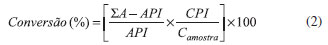 onde: ΣA = Somatório das áreas correspondentes aos picos dos ésteres (C14:0 a C24:0) e do padrão interno (C17:0 - heptadecanoato de metila); API = Área do padrão interno (C17:0); CPI = Concentração do padrão interno na amostra injetada (mg/L); Camostra = Concentração da amostra injetada (mg/L).