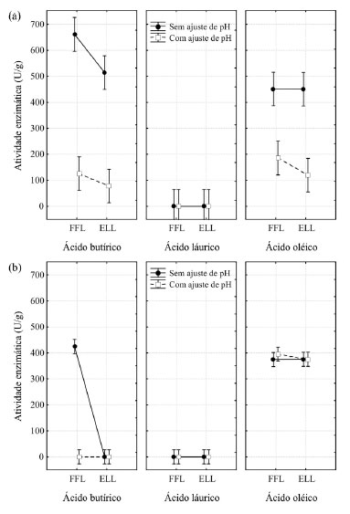 ![]() Figura 1. Atividade enzimática das enzimas liofilizadas produzidas por (a) Aspergillus niger e (b) Aspergillus fumigatus, em condições de produção com pH do meio de cultivo ajustado ou não e a partir de diferentes formas de obtenção da enzima liofilizada (FFL: farelo fermentado liofilizado, ELL: extrato líquido liofilizado)