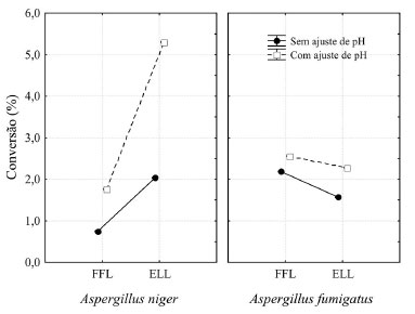![]() Figura 3. Conversões em ésteres etílicos de ácidos graxos obtidas a partir das lipases produzidas em fermentação em estado sólido por Aspergillus niger e Aspergillus fumigatus (FFL: farelo fermentado liofilizado, ELL: extrato líquido liofilizado)