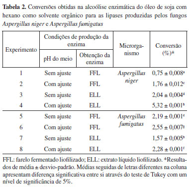 A análise de variância dos resultados para o fungo Aspergillus fumigatus também demonstrou que a interação dos três fatores estudados (ajuste de pH, forma de extração e ácido graxo) foi significativa (p<0,0001), devendo ser analisada. Verifica-se na Figura 1 que utilizando o ácido butírico como substrato na reação de esterificação, somente foi observada atividade (410,75 U/g) na condição de cultivo sem o ajuste do pH do meio de cultivo e utilizando-se o farelo fermentado liofilizado diretamente na reação, sem a etapa prévia de extração da enzima, sendo esse resultado semelhante (p>0,05) aos obtidos com a utilização do ácido oléico como substrato, independente das condições de cultivo utilizadas (atividades em torno de 380 U/g). As enzimas produzidas pelos dois fungos apresentaram comportamento semelhante em relação à especificidade pelos ácidos graxos, ou seja, a especificidade em ordem decrescente foi para o ácido oléico (C18:1) > ácido butírico (C4:0) > ácido láurico (C12:0). Considera-se que ao justificarem-se estes resultados deva-se levar em consideração o tamanho da cadeia carbônica do ácido graxo e a presença da insaturação. Neste sentido verifica-se a maior afinidade das enzimas pelo ácido graxo de cadeia longa. No entanto, este efeito pode estar sendo influenciado pela presença da insaturação do ácido oléico. No estudo da influência da dupla ligação (comparando os rendimentos do C18:0 e C18:1), Bezbradica et al.,34 utilizando a lipase produzida pela Candida rugosa em meio reacional com 2,2,4 trimetilpentano, em condições equimolares dos substratos (álcool utilizado: 3-metil-butanol), verificaram que a síntese do éster de ácido graxo foi duas vezes mais rápida, demonstrando uma afinidade maior dessa lipase por ácidos graxos insaturados, cuja solubilidade é maior em comparação com ácidos graxos saturados. No entanto, deve-se considerar que a solubilidade dos ácidos graxos é também dependente do número de carbonos das moléculas, sendo que quanto menor o comprimento da cadeia, maior a sua solubilidade em água. Em estudo realizado por Sun et al.35 a não linearidade da especificidade em relação ao tamanho da cadeia carbônica foi demonstrada em resultados obtidos somente com ácidos graxos saturados. A lipase utilizada foi produzida por Rhizopus chinensis em fermentação em estado sólido e o sistema reacional consistiu na utilização de n-heptano, ácidos e álcoois em concentrações de 0,6 mol/L. Os ácidos graxos utilizados foram de C4:0 a C16:0 e os álcoois primários do metanol ao 1-octanol. Os resultados obtidos para os ésteres etílicos formados indicaram maior afinidade da enzima pelos ácidos graxos na seguinte ordem, considerando-se as conversões no tempo final de reação: Caprilato (C8:0) > Laurato (C12:0) > Miristato (C14:0) > Palmitato (C16:0) > Caprato (C10:0) > Caproato (C6:0). Verifica-se, no entanto, que nesse estudo o ácido láurico foi o que apresentou a segunda maior atividade, utilizando como aceptor de elétrons o mesmo álcool deste trabalho (etanol). Resultado semelhante ao anterior em relação à especificidade pelos ácidos graxos foi obtido por Vaidya et al.,36 os quais relataram estudo de especificidade utilizando enzimas comerciais imobilizadas. A enzima de Candida antarctica imobilizada em resina de acrilato apresentou melhores resultados de atividade específica quando o ácido graxo utilizado foi o ácido láurico, o que foi explicado pela resistência da difusão de substratos de cadeia longa na estrutura mais rígida das enzimas imobilizadas. Bezbradica et al.34 mencionam que vários fatores podem influenciar na afinidade por ácidos graxos de cadeia curta e longa, como os relacionados à termodinâmica da reação, visto que a formação do éster, obtida após a clivagem do complexo acil-enzima pelo etanol, pode apresentar uma conversão baixa, ou ainda pela premissa de que as lipases possuem regiões hidrofílicas (para ácidos graxos de cadeia curta, com até 6 átomos de carbono) e hidrofóbicas (para ácidos graxos de cadeia longa, com mais de 6 átomos de carbono) ao redor do sítio catalítico. Segundo Zaidi et al.,37 Naik et al.38 e Pleiss et al.39 cada lipase pode ter um comportamento diferenciado. A especificidade enzimática está relacionada com o caráter eletrofílico do carbono na molécula doadora de acila, da acidez, do efeito estérico, da proporção dos substratos e da hidrofobicidade do grupo carboxílico. Assim, a fonte de lipases, o método de imobilização, a natureza do solvente e as propriedades dos substratos podem explicar, segundo os autores, as tendências conflitantes encontradas na literatura para os estudos de especificidade. Silva et al.,27 em estudo da especificidade em termos de atividade de esterificação das enzimas produzidas por Penicillium brevicompactum em fermentação em estado sólido, relataram que o ácido oléico (em combinação com o etanol) apresentou melhores resultados do que com o uso de outros álcoois (metanol, propanol e butanol), enquanto que o ácido butírico apresentou maiores atividades com etanol e butanol. O ácido láurico, por sua vez, apresentou melhores resultados quando do uso do butanol como álcool na reação de esterificação.29 Verifica-se desta forma que as baixas atividades de esterificação obtidas neste trabalho, quando utilizado o ácido láurico, podem estar relacionadas ao uso do etanol. Além disso, outro fator que pode justificar as maiores atividades de esterificação obtidas com o ácido oléico é a possível preferência da enzima por ácidos graxos semelhantes aos presentes nos substratos de produção, como é o caso deste trabalho, no qual o óleo de soja foi utilizado como indutor para a síntese de enzimas. Resultados semelhantes foram obtidos por Silva et al.27 e Rigo et al.40 Alcoólise de óleo vegetal A Tabela 2 apresenta as conversões obtidas na alcoólise enzimátic