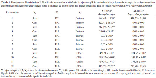 RESULTADOS E DISCUSSÃO Seleção de microrganismos produtores de lipases com atividade de esterificação Dos 5 fungos isolados de solo contaminado com óleo diesel apenas a cepa O-4 apresentou atividade de esterificação (reação entre ácido graxo e etanol), de 364,58 ± 0,30 U/g. Os fungos isolados de efluente da indústria de laticínios não produziram lipases com atividade de esterificação, enquanto que o fungo Aspergillus fumigatus apresentou atividade de esterificação de 182,92 ± 0,47 U/g. As sequências de bases nitrogenadas da cepa O-4 foram comparadas aos dados (18S rRNA) obtidos no GenBank (http://www.ncbi.nlm.nih.gov). A cepa foi identificada como Aspergillus niger cepa DAOM (100% de identidade, código de acesso no GenBank: KC545858.1). Colla et al.21 estudaram a seleção de fungos filamentosos (a partir de efluente de laticínios e solo contaminado com óleo diesel) produtores de lipases com atividade hidrolítica através de fermentação em estado sólido. O fungo Aspergillus niger (O-4) foi um dos melhores microrganismos produtores de lipases com atividade hidrolítica, com máxima atividade lipolítica de 45,49 U/g. No presente estudo observou-se que o fungo Aspergillus niger (O-4) também foi o microrganismo que se apresentou como o melhor produtor de lipase com atividade de esterificação. Fungos do gênero Aspergillus têm sido citados como produtores de lipases.20 Entre as cepas de Aspergillus estudadas neste trabalho o Aspergillus niger tem sido estudado para a produção de lipases com mais frequência que o Aspergillus fumigatus. O estudo de lipases produzidas por Aspergillus fumigatus é mais recente, sendo citado como produtor de lipases por Brooks e Asamudo,31 Rajan e Nair32 e Krikstaponis et al.33 A partir dos ensaios de seleção dos microrganismos potenciais foi realizada a modificação do meio do cultivo em virtude de no processo de seleção terem sido utilizadas condições de cultivo previamente otimizadas para a produção de lipases com atividade de hidrólise.21 Rizzardi20 obteve resultados significativos de atividade enzimática para as condições de 65% de umidade, proporção farelo:casca de 80:20 e adição de 1% de óleo de soja e ureia, sendo estas condições de cultivo, portanto, utilizadas na sequência dos experimentos. Avaliação da especificidade por diferentes ácidos graxos A Tabela 1 apresenta as atividades de esterificação das enzimas produzidas pelos fungos Aspergillus niger (O-4) e Aspergillus fumigatus em 96 h de fermentação, nos planejamentos fatoriais utilizados para avaliar a influência do ajuste de pH do meio de cultivo, do método de extração da enzima e do ácido graxo utilizado na reação de esterificação. Os experimentos realizados sem ajuste de pH apresentaram valor igual a 6,2. As enzimas produzidas a partir do Aspergillus niger (O-4) (Tabela 1) apresentaram atividade frente aos ácidos oléico (C18:1) e butírico (C4:0) na presença de etanol, não apresentando atividade com a utilização do ácido láurico (C12:0). As enzimas produzidas pelo Aspergillus fumigatus não apresentaram atividades de esterificação frente ao ácido láurico, assim como as enzimas produzidas pelo Aspergillus niger (O-4), apresentando atividade frente ao ácido de cadeia curta somente no experimento 1, realizado sem o ajuste do pH do meio de cultivo para 4,5 e utilizando o farelo fermentado liofilizado sem a etapa de extração como fonte de enzimas. A análise de variância dos resultados para o fungo Aspergillus niger demonstrou que a interação dos três fatores estudados (ajuste de pH, forma de extração e ácido graxo) foi significativa (p<0,0001), devendo ser analisada. Verifica-se na Figura 1 que o ajuste do pH do meio de cultivo ocasionou diminuição na atividade frente ao ácido butírico e frente ao ácido oléico. A liofilização direta do farelo fermentado e o uso deste na reação de esterificação permitiu maiores atividades de esterificação frente aos ácidos butírico e oléico, significativamente (p<0,05) diferentes dos valores de atividade obtidos com o pH do meio ajustado a 4,5 (Tabela 1). A atividade de esterificação obtida para o ácido butírico (661,43 U/g) foi significativamente superior (p=0,0099) à obtida para o ácido oléico (451,50 U/g) na condição de cultivo sem o ajuste de pH.