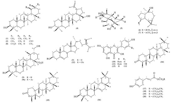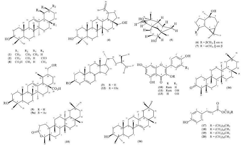 RESULTADOS E DISCUSSÃO O fracionamento cromatográfico de frações no extrato de folhas de Eugenia copacabanensis conduziu ao isolamento de uma mistura de α- e β-amirina (1 e 2),29 β-sitosterol (3),30 betulina (4),31 clovandiol (5),32 globulol (6),33 viridiflorol (7),33 ácido ursólico (8),34 ácido 30-hidroxi-ursólico (9),35 canferol-3-O-β-D-ramnosídeo (10),36 quercetina-3-O-α-L-arabinosídeo (11),37 β-sitosterol glicosilado (12)30 e quercetina (13). O mesmo procedimento com frações do extrato de galhos da planta conduziu ao isolamento da friedelina (14),38 friedelan-3,4-lactona (15),39 taraxerol (16)40 e da mistura dos ésteres cumarato de tetracosanila, cumarato de hexacosanila, cumarato de heptacosanila e cumarato de octacosanila, (17-20) (Figura 1). A identificação das substâncias baseou-se na análise de espectros e comparação de dados com valores descritos na literatura.