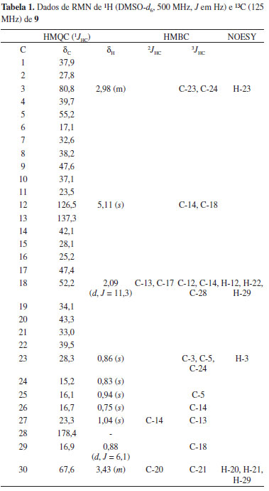 As estruturas de 5, 9, 15 e 17-20 foram determinadas por RMN de 1H e de 13C, incluindo experimentos bidimensionais (COSY, NOESY, HMQC e HMBC). Os experimentos realizados com espectros de massas de alta resolução (EMAR-IES) permitiram confirmar as fórmulas moleculares da mistura de derivados cinâmicos (17-20), veja experimental. No espectro de RMN de 1H da fração contendo 5 foram observados sinais mais intensos correspondentes a este componente majoritário, além de outros sinais compatíveis com outros terpenos em mistura. Os sinais em δH 3,82 (dd; J1=10 e J2=5,8 Hz; 1H) e 3,35 (sl, 1H) foram atribuídos aos hidrogênios 2 e 9, respectivamente. Os sinais referentes às metilas 13, 14 e 15 foram observados em δH 0,97 (s; 3H), 1,05 (s; 3H) e 0,87 (s; 3H), respectivamente. O espectro de DEPTQ (125 MHz, CDCl3) da amostra apresentou 15 sinais, sendo três CH3, seis CH2, três CH e três C, com destaque para os sinais em δC 80,8 (CH-2), 75,1 (CH-9), 31,6 (CH3-13), 28,4 (CH3-14) e 25,5 (CH3-15). Esses dados aliados aos valores de m/z detectados no espectro de massas (veja experimental) foram compatíveis com a fórmula C15H26O2. As correlações observadas nos experimentos bidimensionais (COSY, HMQC e HMBC) e comparação com valores da literatura32 permitiram identificar o componente 5 como o sesquiterpeno clovandiol e as correlações entre H-2/H-13, H-2/H-3, H-5/H-14, H-9/H-15 e H-15/H10, observadas no espectro de NOESY, serviram como base para a proposta da configuração relativa representada na Figura 1. Esta fração apresentou-se como um óleo amarelado e, como descrito acima, foram identificados sinais compatíveis com outros componentes em mistura. Sendo assim, fez-se análise com CG/EM e detectaram três picos com tempos de retenção 14,48, 15,30 e 16,14 minutos, referentes às substâncias 6 (30,0%), 7 (26,6%) e 5 (53,4%), respectivamente. Os espectros de massas foram comparados aos da biblioteca e, além de confirmar a proposta para 5, foram identificados os componentes 6 e 7 (Figura 1), que são compatíveis com os demais sinais observados no espectro de RMN 13C. A substância (9) foi obtida da fração diclorometano de folhas de E. copacabanensis como um sólido branco com ponto de fusão 282-285 ºC. No espectro de RMN de 1H foram observados sinais referentes a hidrogênios metílicos em δH 0,75 (3H, s, H-26), 0,83 (3H, s, H-24), 0,86 (3H, s, H-23), 0,88 (3H, d, J=6,1 Hz, H-29), 0,94 (3H, s, H-25) e 1,04 (3H, s, H-27), sugerindo a presença de seis metilas. Foi observado um multipleto em δH 2,98 (1H, m, H-3), característico de hidrogênio carbinólico em triterpenos 3β-OH, um sinal em δH 5,11 (1H, sl, H-12) típico de hidrogênio olefínico e um sinal em δH 2,09 (1H, d, J=11,3 Hz, H-18) referente ao hidrogênio do carbono metínico e alílico H-18, permitindo sugerir a presença de triterpeno com esqueleto ursano. Esses dados em conjunto com a análise do espectro de RMN de 13C (Tabela 1), com destaque para os sinais em δC 124,7 e em δC 138,0 referentes aos carbonos olefínicos CH-12 e C-13, e os sinais em δC 76,8 e 178,4 atribuídos aos carbonos carbinolíco (CH-3) e carboxílico (C-28), respectivamente, permitiram sugerir a estrutura de um derivado do ácido ursólico (8). A presença de apenas seis metilas e o sinal em δC 67,8 característico de carbono oximetilênico (CH2-30), permitiram sugerir a ocorrência de oxidação em uma das metilas do ácido ursólico. No experimento de HMBC foram observadas as correlações a longa distância entre o hidrogênio oximetilênico δH 3,43 (2H, m, H-30) com os carbonos metilênicos em δC 33,0 (CH2-21) e 39,5 (CH2-22) e, adicionalmente, a ausência de um sinal em torno de δC 21, que no ácido ursólico corresponde à metila CH3-30, sugeriram a oxidação da metila nesta posição. A presença das duas hidroxilas na molécula foi confirmada a partir de análises dos espectros de RMN de 1H e de 13C do derivado 9a. A análise dos dados de RMN, incluindo experimento de NOESY, permitiram identificar 9 como o ácido 30-hidroxi-ursólico, com a estereoquímica relativa como apresentada na Figura 1, e fazer o assinalamento dos dados de RMN de 1H e 13C de 9 (Tabela 1) e 9a (veja experimental). Este triterpeno foi descrito anteriormente nas espécies da família Rubiaceae, Rubia cordifolia35 e Randia siamensis.41 A substância 15 foi isolada a partir de um precipitado obtido do extrato em metanol dos galhos de E. copacabanensis. A análise dos dados de RMN de 1H e 13C sugeriu a presença de um triterpeno com esqueleto friedelano, similar a friedelina (14). No espectro de RMN de 1H foi observado um sinal em δH 4,21 (1H, m, H-4) característico de hidrogênio oximetínico em sistemas cíclicos e em δH 2,65 (1H, dd, J1 = 6,9 e J2 = 13,9 Hz, H-2) e 2,50 (1H, t, J = 12,9 Hz, H-2) foi observado um conjunto de sinais característicos de hidrogênios diastereotópicos de grupo metileno vizinho a carbonila. No espectro de RMN de 13C destacam-se os sinais em δC 175,9 (C-3), característico de carbonila de lactona, e em δC 85,2 (CH-4) que caracteriza um carbono oximetínico vizinho a carbonila. As correlações observadas no espectro de HMBC entre H-4/C-3, H-4/C-10, H-2/C-3 e H-2/C-10 confirmaram a caracterização do anel lactônico. Os dados espectroscópicos de RMN de 1H e 13C desta substância, incluindo bidimensionais, estão de acordo com aqueles descritos para a friedelan-3,4-lactona isolada da espécie Casearia vetutina Bl. (Flacourtiaceae).42 Este é o primeiro relato da ocorrência desta terpenolactona em Myrtaceae. O assinalamento dos deslocamentos químicos de hidrogênio e carbono-13 está descrito na parte experimental. A mistura composta pelas substâncias 17-20 foi obtida a partir do extrato em metanol dos galhos, na forma de um sólido branco. No espectro de RMN de 1H da mistura foram observados dois dupletos em δH 7,45 (2H, d, J = 8,3 Hz, H-2 e H-6) e 6,84 (2H, d, J = 8,3 Hz, H-3 e H-5) com constante de acoplam