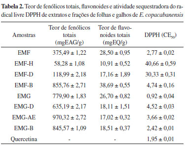 O ensaio de determinação do teor de flavonoides totais empregou o reagente AlCl3, que forma complexos estáveis com os flavonoides em meio metanólico, podendo ser monitorados por espectrofotometria a 415 nm.43 A fração em n-BuOH das folhas apresentou o maior teor de flavonoides totais (38,69 ± 0,55 mgEQ/g), em comparação às demais amostras analisadas (Tabela 2). Nos galhos, o extrato em MeOH apresentou o maior teor de flavonoides (26,70 ± 0,82 mgEQ/g), seguido das frações em EMG-B (18,51 ± 0,37 mgEQg), EMG-AE (17,02 ± 0,32 mgEQg) e EMG-D (18,11 ± 1,51 mgEQg). Estes resultados sugerem que as folhas e galhos de E. copacabanensis são ricos em teores de flavonoides quando comparados a outras espécies de Eugenia.44,45 Atividade sequestradora do radical DPPH Vários métodos são utilizados para determinar a atividade antioxidante em extratos vegetais. Dentre estes, um dos mais empregados consiste em avaliar a atividade sequestradora do radical livre 2,2-difenil-1-picril-hidrazila (DPPH), púrpura que apresenta um pico de absorção em 517 nm.46 Os extratos e frações das folhas e galhos de E. copacabanensis apresentaram atividade sequestradora de radical livre com CE50 variando de 0,92 ± 0,04 a 40,66 ± 0,59 µg/mL. Desta forma, podemos afirmar que todas as amostras analisadas apresentaram promissora atividade antioxidante. O extrato em metanol dos galhos (EMG) apresentou a maior atividade antioxidante dentre as amostras analisadas (CE50= 0,92 ± 0,04), sendo mais ativo que o padrão quercetina (Teste de Tukey, P<0.05). Os valores de CE50 dos extratos, frações e o padrão estão descritos na Tabela 2. A correlação entre fenólicos totais e a atividade antioxidante de extratos vegetais tem sido descrita regularmente na literatura.47 Os compostos fenólicos, especialmente flavonoides e proantocianidinas,48,49 têm sido relatados como os principais responsáveis pela atividade antioxidante dos extratos botânicos. A boa correlação observada entre o teor de fenólicos totais e a atividade antioxidante de E. copacabanensis, avaliada pela atividade sequestradora do radical livre DPPH (R2 = 0,72), indica que as substâncias fenólicas, como os flavonoides e cumaratos isolados neste estudo, são responsáveis pela boa atividade antioxidante desta espécie.