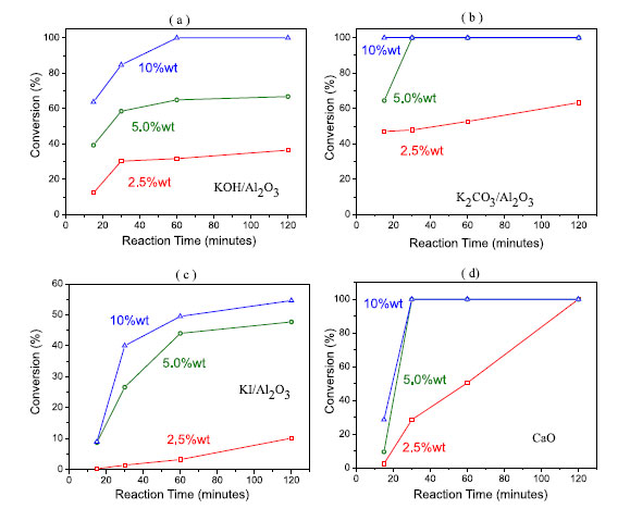 Soap formation increases with irradiation time and quantity of catalyst, and this in turn leads to lower biodiesel conversion. Figure 3 shows that CaO produces larger amounts of soap compared to the other catalysts. For all the catalysts, there is an increase in soap formation over time. However, the amount of soap produced when 2.5 and 5% of K2CO3/Al2O3 were employed remained constant and at a relatively low value. The catalysts KOH/Al2O3 and KI/Al2O3 have intermediate characteristics. They tend to show soap formation over time, but to a lower extent than calcium oxide. The high degree of soap formation observed with pure CaO may be related to its greater basic strength compared to the other supported catalysts. This is caused by the thermal decomposition of the carbonate and dehydroxylation of the OH groups during calcination.9 Influence of the catalysts on biodiesel conversion Figure 4 shows the biodiesel conversion as a function of the catalyst concentration and reaction time for the four best catalysts in this study.