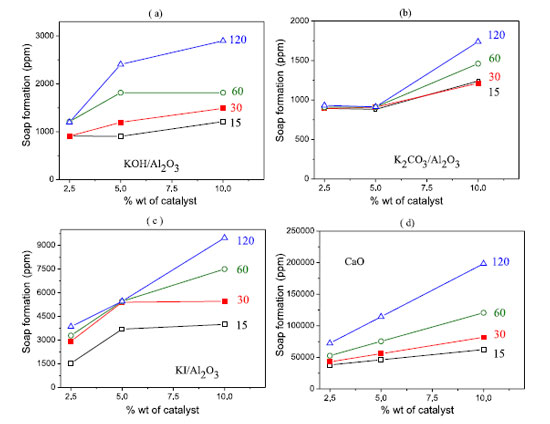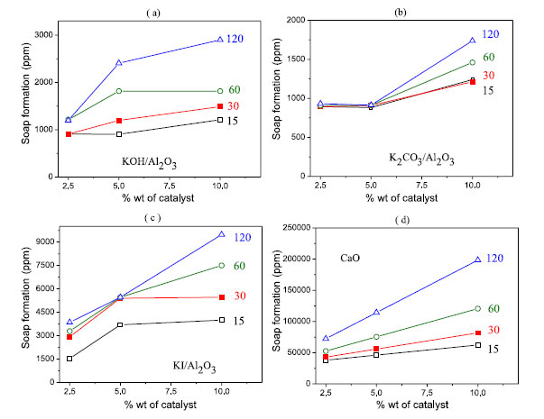 Figure 3. Soap formation and catalyst amount for the heterogeneous catalysts KOH/Al2O3 (a), K2CO3/Al2O3 (b), KI/Al2O3 (c) and CaO (d) with reaction times of 15, 30, 60 and 120 min. Methanol to oil molar ratio used was 16:1