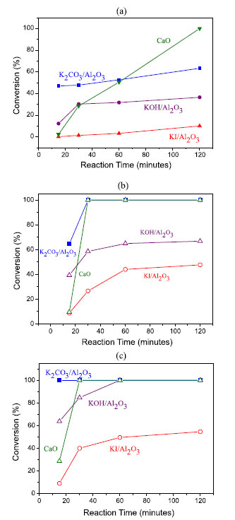 ![]() Figure 4. Biodiesel conversion against reaction times for each catalyst employing 2.5% (a), 5% (b) and 10% (c) of mass catalyst concentration (methanol-sunflower oil molar ratio of 16:1)