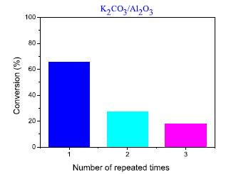 ![]() Figure 5. Biodiesel conversion with the reuse of K2CO2/Al2O2. Reaction conditions: methanol:oil (16:1 molar ratio); catalyst amount, 2.5wt. %; reaction time, 30 min; 70 ºC