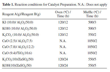 EXPERIMENTAL SECTION Materials Refined commercial sunflower oil purchased from a supermarket in Cuiabá, Mato Grosso State, Brazil was used in this study. The main chemical composition (fatty acid composition, wt%) of sunflower oil is reported in the literature,43,44 and its density43 and mean molecular weight44 are 0.92 g cm-3 and 861,22 g mol-1 respectively. Methanol (99.8%), CDCl3 (99.8%), and neutral Al2O3 were purchased from Tedia, Cambridge Isotope Laboratories, Inc. and Vetec, respectively. The supported catalysts, KI/Al2O3, KOH/Al2O3, K2CO3/Al2O3, CaO/Al2O3, CaO/MnO2, CaO/TiO2, K2CO3/ZnSO4, KOH/ ZnSO4, and H2SO4/TiO2, were obtained via sedimentation followed by calcination of the catalyst active mass on the mounting surface, as described below. Reagent A was diluted in a sufficient amount of water to obtain a saturated solution. This was followed by addition of reagent B and stirring for homogenization. The mixture was subsequently dried in an oven and calcined in a muffle furnace. The reaction conditions are described in Table 1.