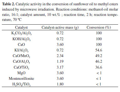 CONCLUSION The catalytic activities of 24 heterogeneous catalysts were investigated in a microwave-assisted transesterification reaction for methylic biodiesel production using sunflower oil in a microwave monomode reactor. The effects of the catalyst amount and irradiation time on the biodiesel conversion were studied as well as the influence of the mass of the catalyst and irradiation time on the soap formation. Microwave-induced transesterification showed a four-fold reduction in the reaction time compared with conventional heating. High biodiesel conversions were obtained with K2CO3, K2CO3/Al2O3, and CaO. The best results were obtained when 5% K2CO3/Al2O3 and CaO, in a 16:1 methanol-oil molar ratio, were allowed to react for 30 min at 70 ºC. CaO supported on alumina and titanium oxide showed an appreciable decrease in the amount of soap formation, but also a decrease in biodiesel production. Therefore, K2CO3/Al2O3 was the most promising catalyst, with a relatively high conversion of oil to biodiesel and low rate of soap formation. The repeated activity of this catalyst was investigated, and a reduction in the biodiesel conversion due to the decomposition of the catalyst was observed. In conclusion, considering the 24 heterogeneous catalysts studied, it was found that the pure or alumina-supported K2CO3 catalysts exhibited excellent catalytic activity for the transesterification of sunflower oil under microwave irradiation.