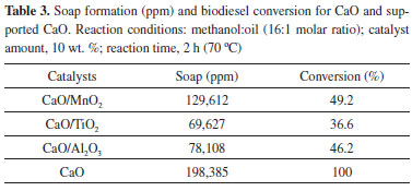 RESULTS AND DISCUSSION Screening of the catalyst A screening of catalytic activity of the 24 supported and non-supported heterogeneous catalysts for sunflower oil transesterification was performed. Sixteen milliliters of methanol were chosen as the reference volume for all of the reactions, i.e., a methanol-oil molar ratio of 16:1, which is in agreement with the literature,9 which reports an optimum molar ratio of 15:1. At values above this molar ratio, the addition of methanol had no significant effect on the conversion.9 The same reaction conditions were employed for each catalyst, allowing for direct comparisons. Appreciable conversions (above 30%) were only obtained for a few catalysts, and the remainder afforded conversions of less than 1%. The results are summarized in Table 2.